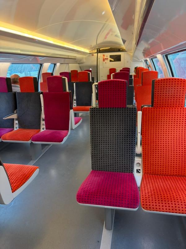車内はいかにもフランスらしい色使い。フランスでこの色+黄緑色なんていう組み合わせもあるよね。