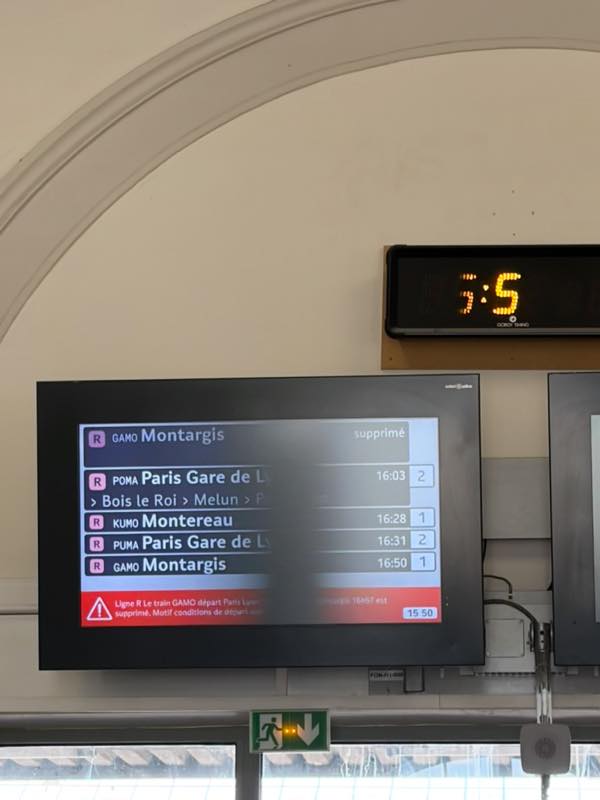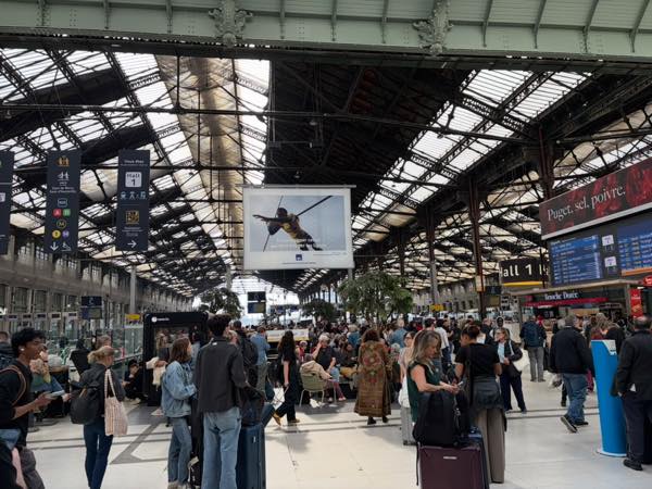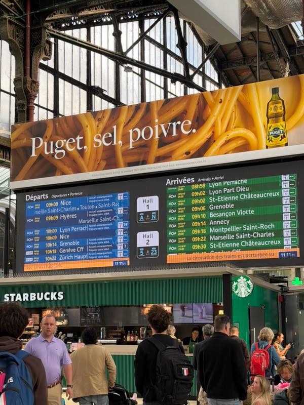 Gare de Lyon駅に到着したら結構な人混み。翌週この駅からスイスに向けて移動する予定なので下見も兼ねてぶらぶらします。時刻表を見たらほぼすべての長距離列車が遅れてるみたい。