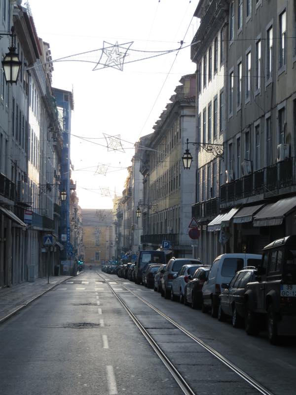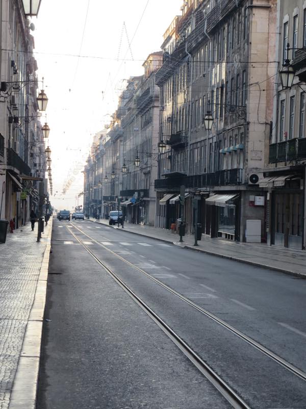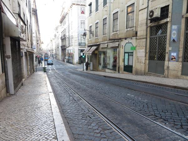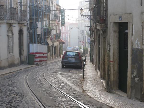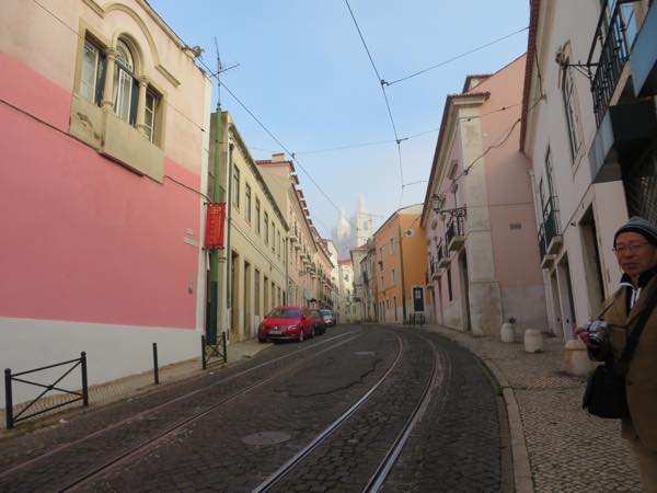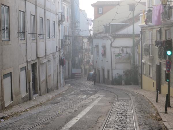 薄い霧で覆われたリスボンの街。この坂道を行くトラムを撮影するために歩きながら待つ