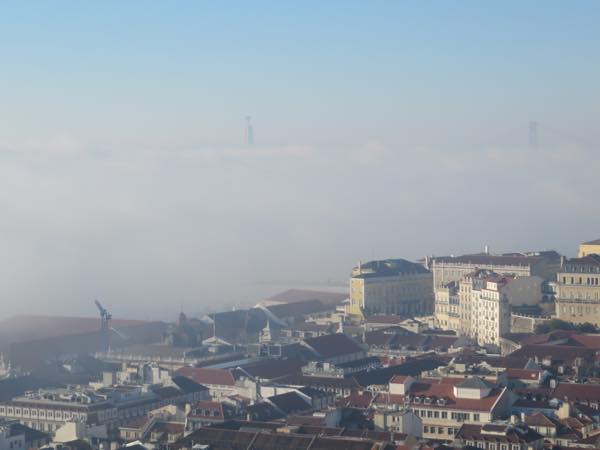 古い城から見るリスボン中心部。左はテージョ川。朝気温が下がるので川は霧で覆われている。