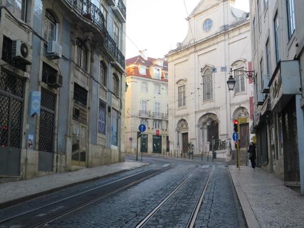 遠くにさっきの教会が見えます。 トラム28番線にてリスボン中心部に戻る途中、サンジョルジュ城付近で下車し、城の入り口に向かう。