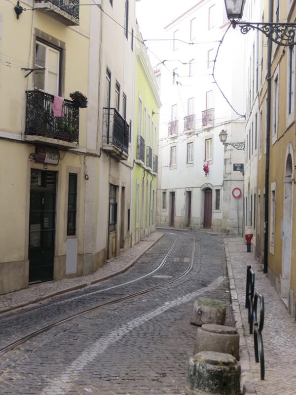 薄い霧で覆われたリスボンの街。この坂道を行くトラムを撮影するために歩きながら待つ