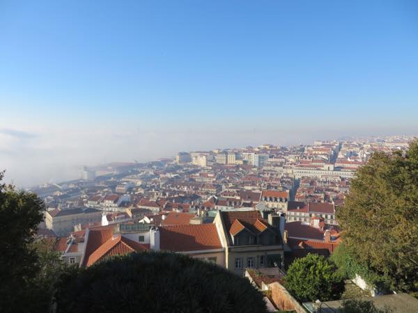 古い城から見るリスボン中心部。左はテージョ川。朝気温が下がるので川は霧で覆われている。