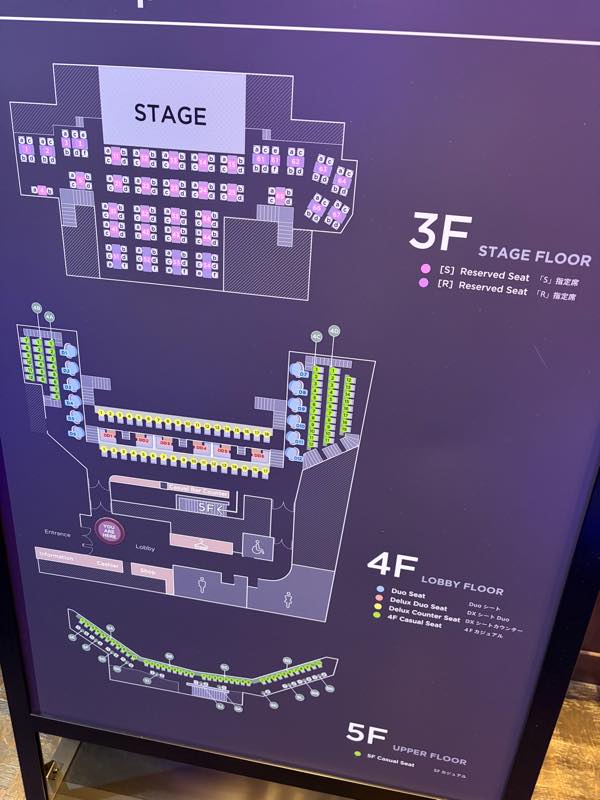 よって座席を選ぶこともできず残っていたステージと同じレベルの3FのRシートという端っこの席。座席表見てもステージが見渡せるなんてことはまず無理な席。これなら5Fの観覧席の方がいいなぁと思いましたが贅沢は言えません。